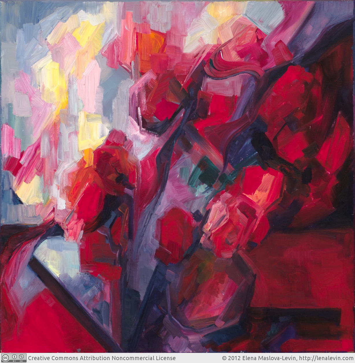 All in all, by the end of the quatrain, the speaker is left more hurt, and his friend, more guilty, than they were at the beginning. The quatrain ends abruptly, as though from the lack of breath after climbing the staircase of participles. This quatrain's frantic syntax gives my painting its overall rhythms and movement. For to thy sensual fault I bring in sense.. Sense; a word which might just claim the first place in the world-wide championship for the most self-contradictory meaning, here highlighted by its opposition with sensual. Does the speaker mean that what we have heard so far was the voice of reason, an intellectual construct opposed to sensuality? Would this reading be sensible? Or is it the same "sense" that forms the stem of "sensual"? His capacity to feel? One or all of his senses? Like a little crystal ball, this word pulls in and pushes out into plain sight all internal contradictions reflected in the poem. In the painting, it translates into somewhat tortured attempt at plain black-and-white geometry, which breaks and transforms the space around the roses. In the poem, the mention of "sense" triggers a chain of legal metaphors, an imaginary court in which nobody knows who is the defendant, who is the accuser, and, most conspicuously, who is the judge; but court proceedings aren't strong enough a metaphor, and the quatrain ends in civil war within the speaker's mind and soul: For to thy sensual fault I bring in sense – That I an accessory needs must be The last sentence of the sonnet crosses the structural boundary in the sonnet's structure. And yet, the poem ends with a rather weak contrast between sweet and sour, which sounds almost like a (sour) reconciliation after everything we have heard. I am an accessory to my sweet thief: not because I defend him, but because I hurt myself even more than he did. Here is Polly Frame reading this sonnet, although she does break its rhythms with stressing some words "properly", but not like the poem wants them to be stressed. |